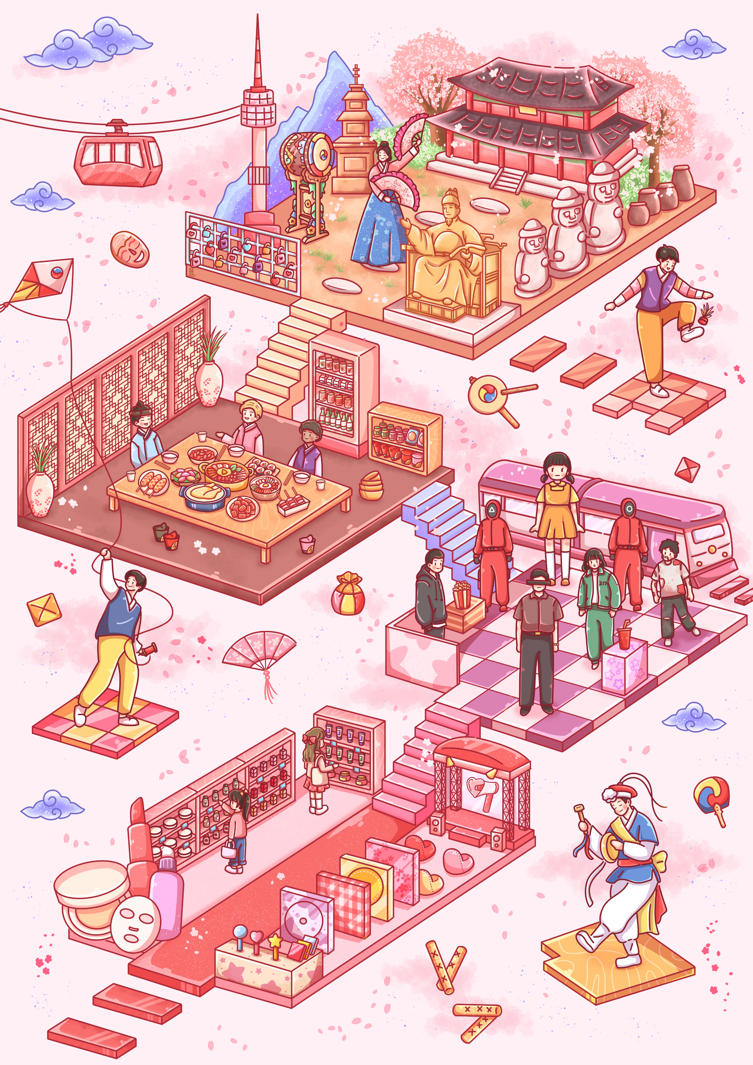 Anna: In introducing the Korean category, I used the theme "Step of Hallyu''. I got the idea based on myself and everyone who got into Hallyu. This interest started with knowing about K-beauty and K-pop, which most people definitely know about, and then moving on to watch K-drama. It's interesting as we can watch it everywhere, and now many people have watched K-dramas and K-movies. After that, people can learn about K-food, history, and traditional things in Korean culture. From all of that, I tried to put it all in one place and draw it in my style.