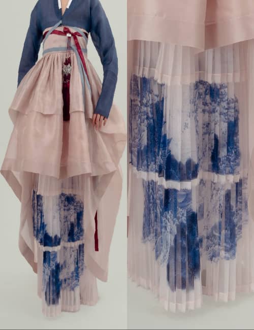 I wanted to express the depth that cultural heritage possesses. So, I melted images inspired by relics such as 'An Jung-sik' 's "Seonsan-Nugakdo" and the Joseon royal square glass on the hanbok. This heritage collection focused on showing the depth and beauty of our traditional culture.