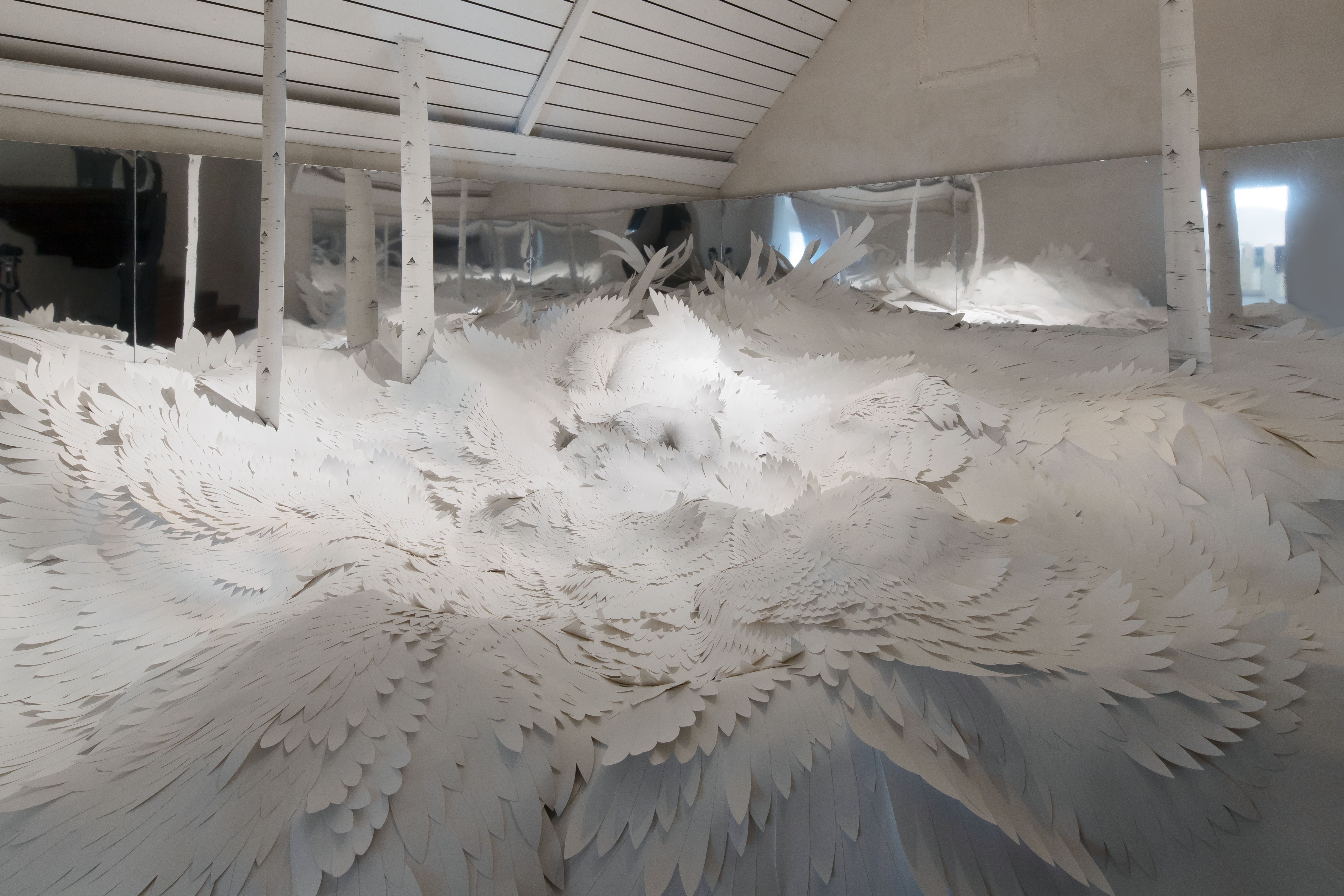 « Lors de mon exposition à l’Atelier d’Estienne à Pont-Scorff l’année dernière, j’ai retravaillé l’installation La Mer Blanche ainsi que Tissage. Bien que ce soient des œuvres que j’avais déjà présentées ailleurs, chaque espace leur donne une nouvelle dimension, et j’ai dû adapter leur déploiement en fonction de l’architecture du lieu. Dans La Mer Blanche, j’ai couvert toute la salle de plumes découpées et recomposées pour immerger le spectateur, comme s’il était plongé dans la mer ou à l’intérieur d’un oiseau immense. L’idée était de jouer avec cette perception : un oiseau si vaste qu’on ne peut jamais l’embrasser du regard, parce qu’on est déjà en lui, permettant ainsi au public de ressentir physiquement cette immersion. Parfois, un détail dans l’architecture d’un lieu déclenche une nouvelle création. Pour une exposition à Cannes, par exemple, la salle contenait un ascenseur condamné, transformé en une sorte de cage en grillage de fer. Ce dispositif m’a inspiré la création d’un oiseau gigantesque, composé de plumes attachées à une chaîne. La porte de la cage était ouverte, mais l’oiseau restait prisonnier, non pas par une contrainte physique, mais par une entrave mentale – une métaphore de nos propres enfermements intérieurs, ces barrières invisibles qui nous retiennent malgré nous. »
