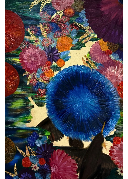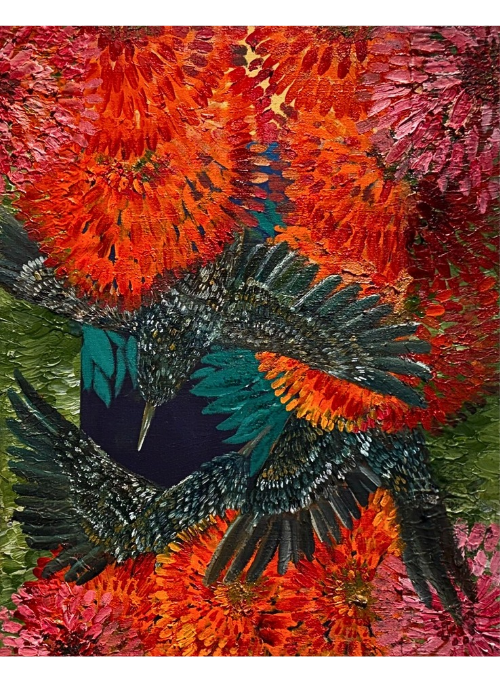 My artwork explores life in its vitality, complexity, and interconnectedness. Through painting, I aim to express the profound relationships between human and non-human beings and reflect how this connection shapes our emotional, logical, and philosophical perspectives. Each piece seeks to construct a visual language that evokes beauty and invites reflection, encouraging viewers to consider how we live, what we value, and our place within broader ecological and cultural landscapes. Central to my practice is the concept of vitalism, the belief that life extends beyond mere mechanical function. Moments of presence and absence in the natural world—such as a bird's fleeting shadow, a flower's bloom and decay, or the silence that follows a loss—inspire my work. These moments highlight that living fully involves action, survival, feeling, perception, and connection. Symbolic imagery, including birds and flowers, frequently appears in my art, carrying layered meanings. Birds often suggest themes of fragility, freedom, memory, and transience. Their constant movement and liminal existence mirror human emotional and existential states. Many species represented are endangered or extinct, reflecting concerns about climate change, cultural loss, and ecological imbalance. Rather than approaching these themes with despair, my work focuses on reverence, contemplation, and hope. I believe art can elevate awareness and foster responsibility towards nature and non-human beings in society.