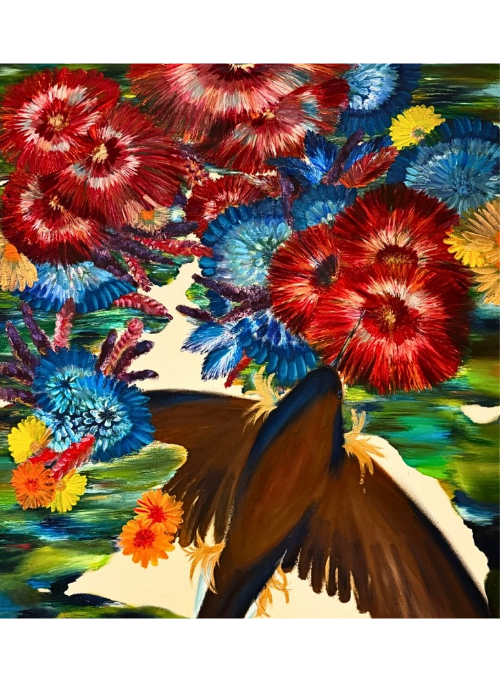 My compositions are infused with rich cultural, emotional, and scientific symbolism. Birds and flowers serve as anchors, representing celebration, mourning, transformation, inquiry, and weaving broader narratives through their inherent beauty. Meanwhile, texture, line, and color create a visual language that powerfully conveys emotions and thoughts. Each painting becomes a contemplative space where beauty and ideas intertwine, inviting viewers to engage in a deeper dialogue through observation and feeling. This experience encourages them to reminisce and connect their own stories to the work before them.