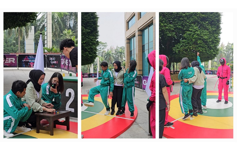 The triathlon arena was a colorful circle track resembled the one in the Squid Game season 2. This one was smaller in size. The track was divided into four sides, one side with the starting point sign, and the other three sides with a pink guard sitting behind a classroom-like table waiting for us to play the game. To play this game, we were divided into a group of three players. I was teamed up with Ibnu Malik, an Honorary Reporter compatriot, and Deviayu Mustika, a player we just met onsite. Entering the arena, our leg was tied together like in the series. To win the game, each team needed to finish the three games in a 'four-leg' race within two minutes. The first game was biseokchigi (the flying stone game). I played this game and successfully hit the stone on my second try. The next game was gonggi (five pebbles picking, throwing, and catching game). It was a one-round gonggi game, where the player needed to pick up the pebbles one at a time. Deviayu was the player. As she successfully caught the 5 pebbles in less than one minute, we were able to proceed to the last game, jegichagi (a Korean traditional shuttlecock 'jegi' kicking game). Here, a player needs to kick the jegi two times consecutively. Ibnu was able to kick the jegi on time and we made it to the finish line. Two pink guards holding a pink finish rope were waiting for us.