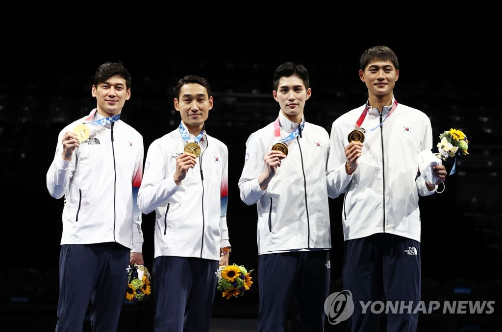 Korea Men's Saber Team won the gold medal: Gu Bongil, Kim Junghwan, Won Woo-young and Oh Eunseok (L to R)
