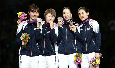 Korea Women's Épée Team won the silver medal: Choi In Jeong, Jung Hyo Jung, Shin A Lam, and Choi Eun Sook (L to R)