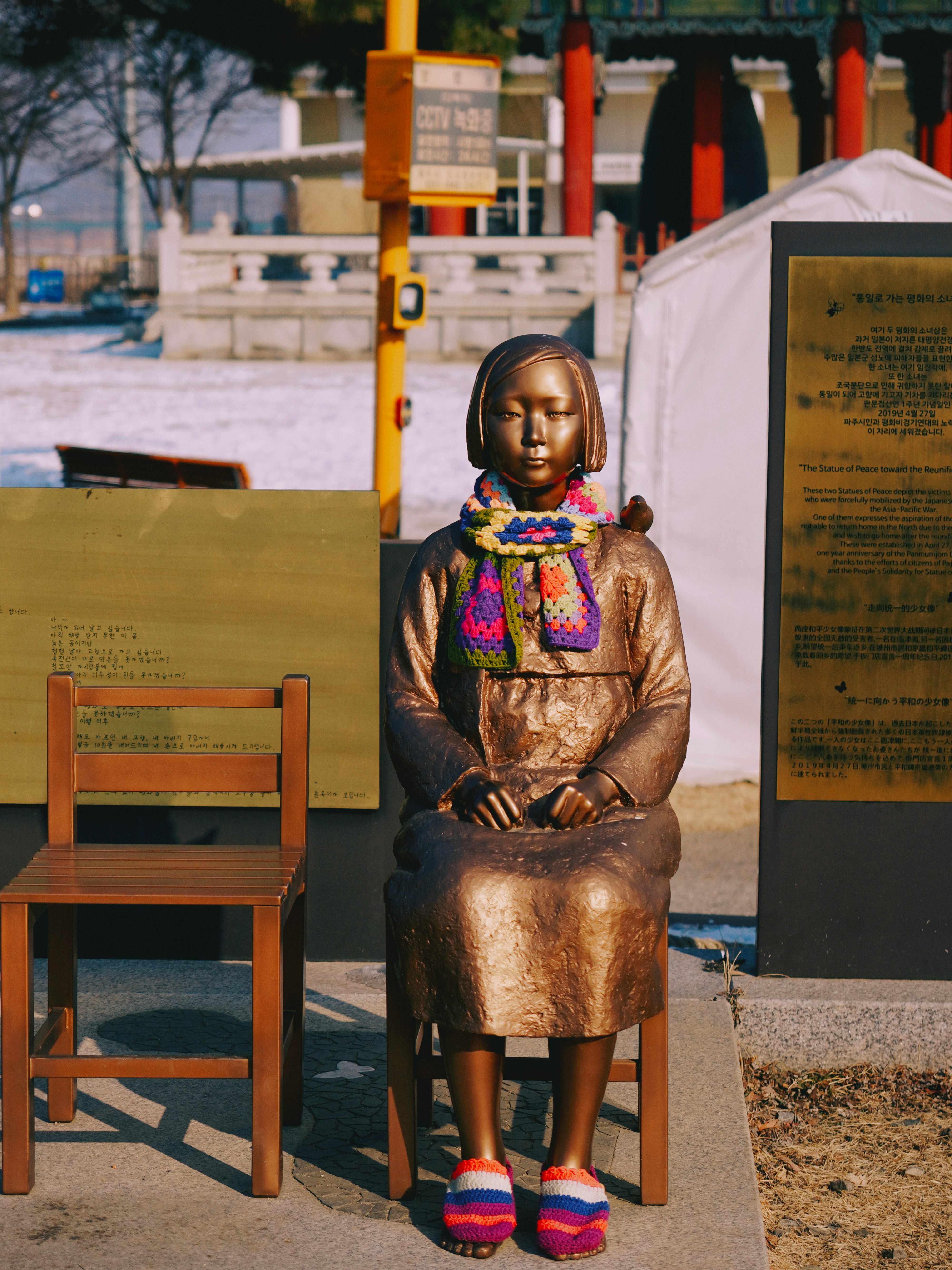 Globally, over 40 memorial statues exist—from Germany to Australia, from Canada to Shanghai. Many depict young girls in traditional Korean dress, often seated alone, symbolizing stolen childhoods and silent suffering. Survivors embrace the statues, and supporters wrap them in scarves in the winter and decorate them with garlands of flowers in the summer.