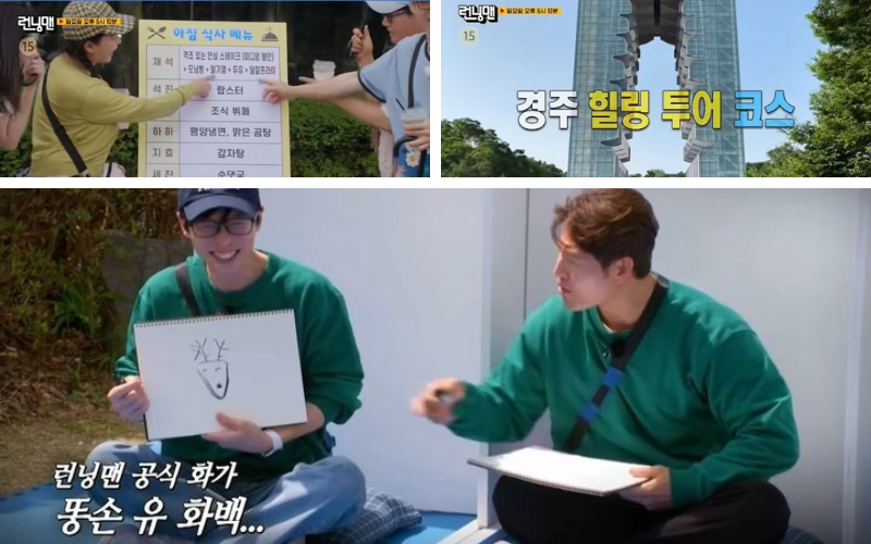 The images show scenes from episodes of Running Man, highlighting aspects of tourism promotion: the top right image shows a tourist attraction, the top left shows a Korean menu, and below is one of the program’s famous games (photos from the program’s official Instagram account)
