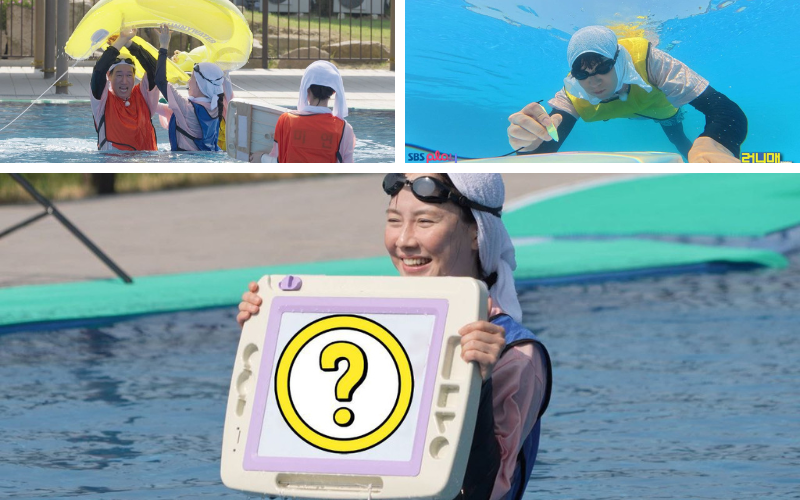 The images also depict one of the program’s games, where members compete to reach a drawing board underwater, sit on a floating platform, and answer questions (photos from 'Running Man' official Naver account).