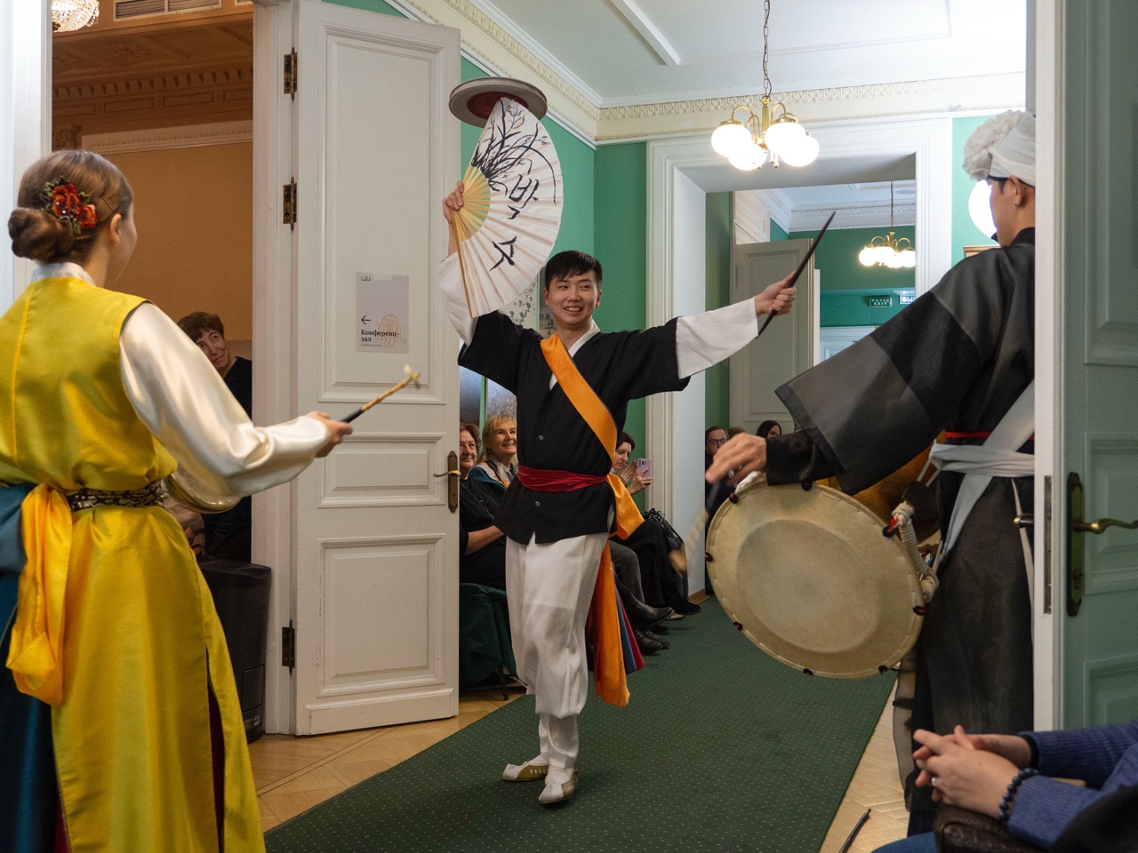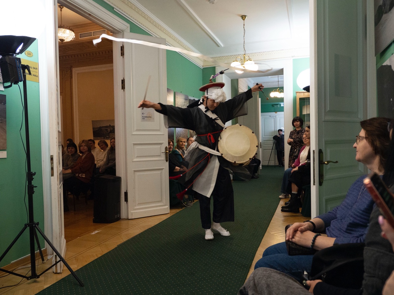 Затем последовало еще одно выступление артистов с корейскими традиционными инструментами. Некоторым зрителям даже повезло поучаствовать в номере и поиграть с 버나 (бона) – вращающейся тарелкой.