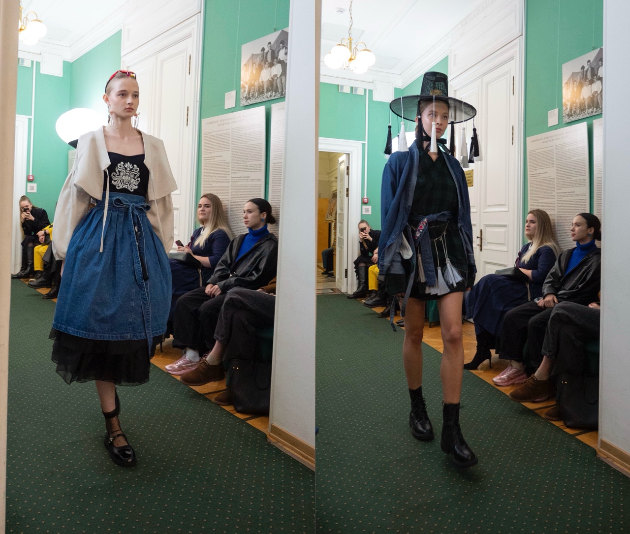 Плавная музыка во время дефиле создала атмосферу уюта и покоя. После показа коллекции первого дизайнера состоялись два зажигательных номера от студентов K-ARTS – «Комму» (танец с саблями) и «Чиндо букчум» (танец с барабаном).