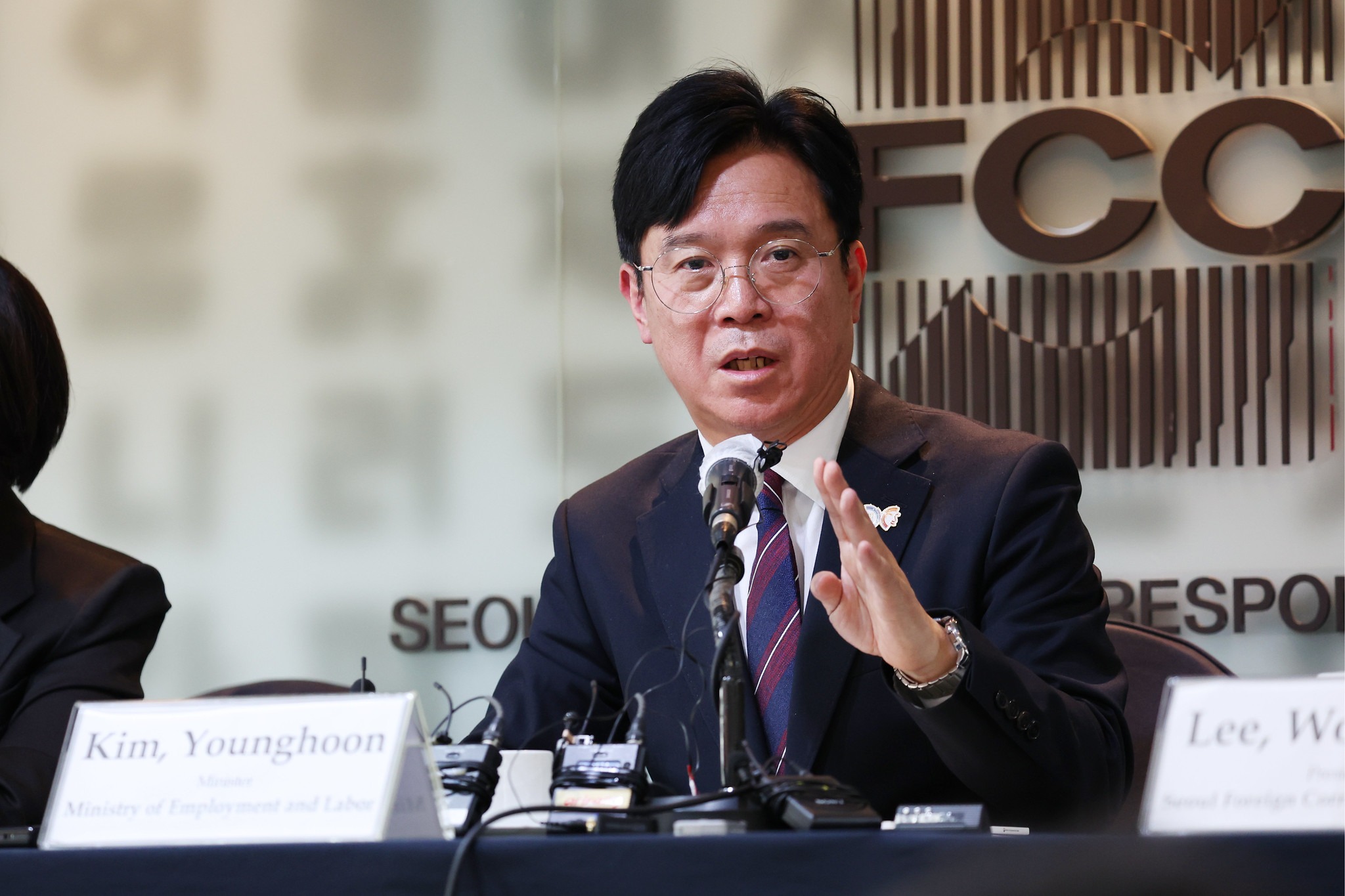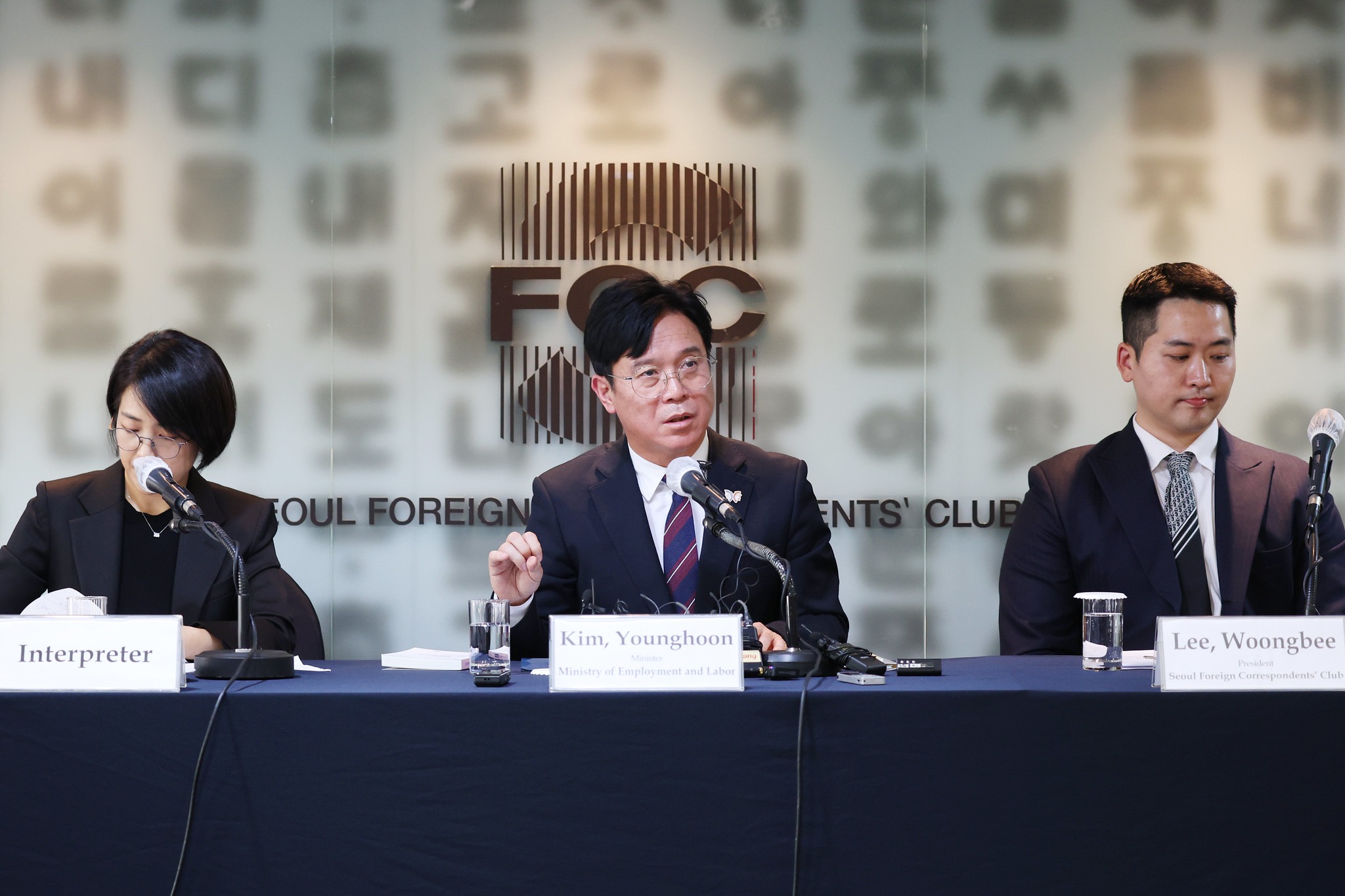 Image caption: Minister of Employment and Labor Kim Young Hoon speaking at the Seoul Foreign Correspondents Club's briefing at the Korea Press Center on October 20th. Image provided by Korea.net.