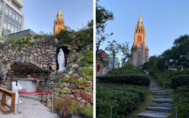 Der neugotische Baustil mit Spitzbögen, hohen Fenstern und dem schlanken Turm war für Korea ungewöhnlich. Die Kirche war die erste große katholische Kathedrale des Landes, und schon ihr Standort war ein Symbol: Myeong-dong war damals wie heute ein Zentrum von Handel und Begegnung. Dass sie im Herzen von Myeong-dong steht, zeigt, wie sehr der junge katholische Glaube damals sichtbar werden wollte.