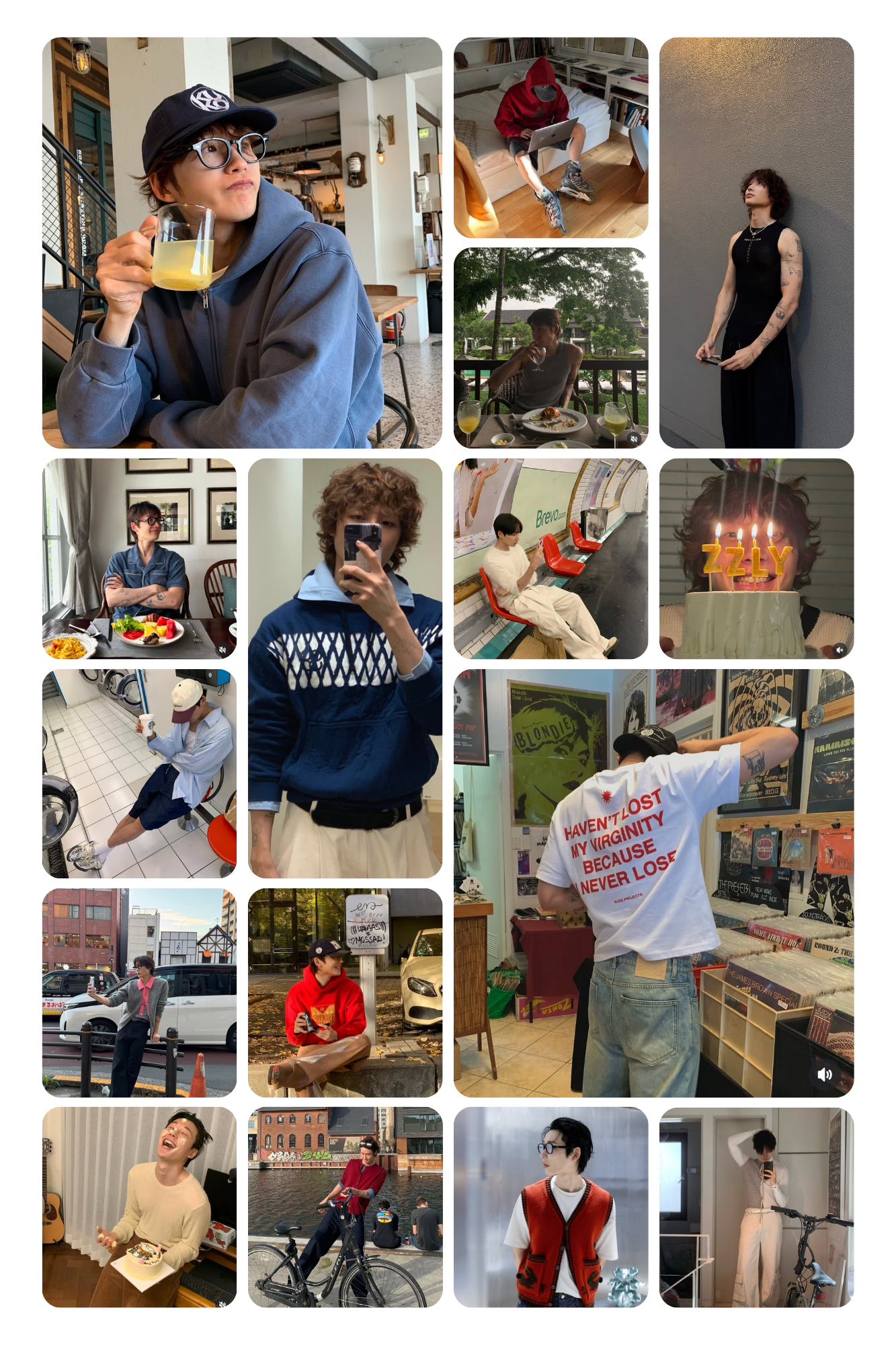 This admission comes as a surprise: his Instagram feed presents a consistently curated yet natural and candid collection—a window into the emotional atmosphere his music creates. What stands out across his page is his distinctive way of taking self-portraits through all kinds of reflective surfaces—windows, mirrors, doors, and more. His love for fashion is also evident, and it, too, plays a quiet but deliberate role: clean silhouettes, muted tones with the occasional accent color, the kind of effortlessness that requires real attention to detail.