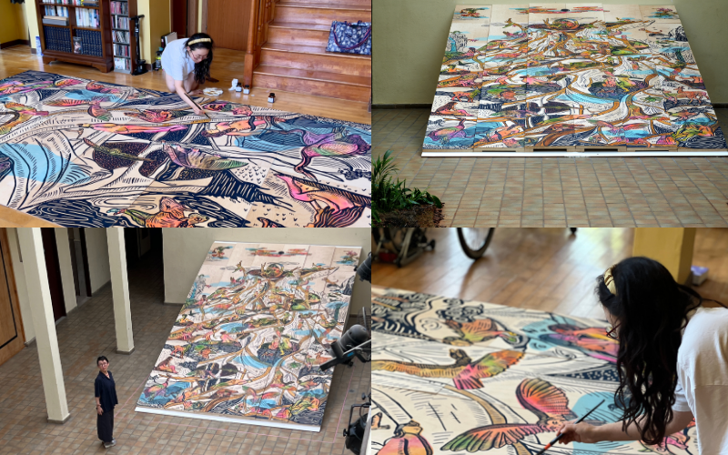 The shipment consisted mainly of the thirty-six birch-plywood panels that make up Invisible Forest, built with layers of monotype and silkscreen to create a flowing forest of roots and river-like forms. It also included works from my printmaking series, such as Flowing Forest, Mushroom Power, and new drypoint drawings, blending elements from South American and Korean forests.