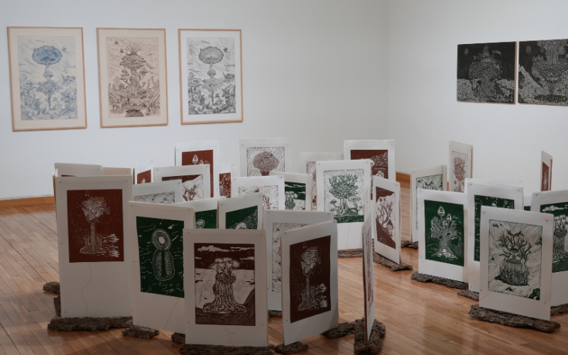 The central installation — 36 birch-plywood panels shipped from Korea to Brazil, “almost like transporting an entire forest across the ocean,” as she describes — combines layers of monotype and silkscreen to evoke movement, fluidity, and forms that grow in unseen directions. The exhibition is presented by the Korean Cultural Center in Brazil (KCCB) and organized by Seletivo.art.
