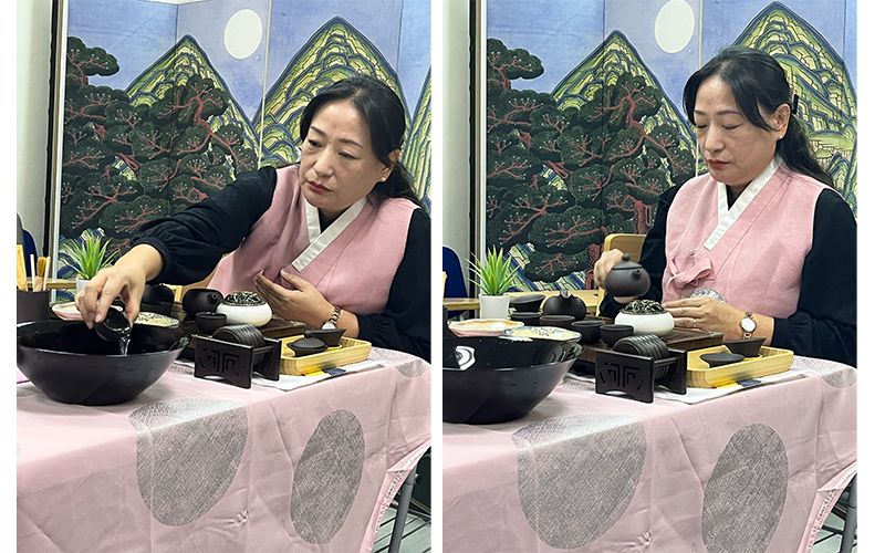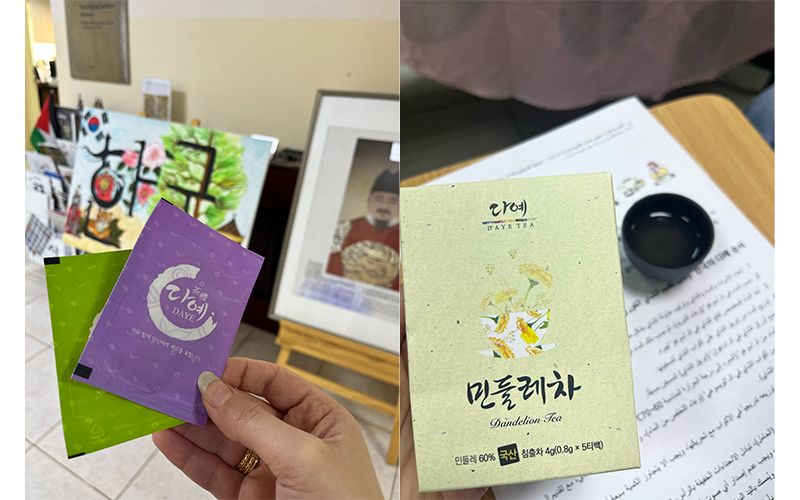 بدأت المعلمة الكورية بتقديم شرحٍ وافٍ عن آداب تناول الشاي الكوري، المعروف باسم 'دادو' موضّحة أنّ هذا الاسم يحمل معنى 'طريق الشاي' أو 'فن الشاي' ففتحت لنا بابًا على عالمٍ يتعامل مع الشاي بوصفه حوارًا داخليًا قبل أن يكون شرابًا. تحدّثت عن أنواعه المتعددة بنكهات لذيذة، بعضها يزهر على اللسان برائحة الأعشاب وبعضها يحمل نكهة الفواكه أو الجذور التي تشتهر بها الجبال الكورية.