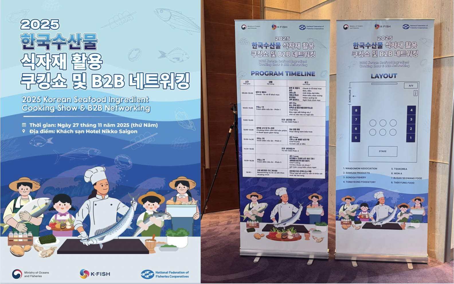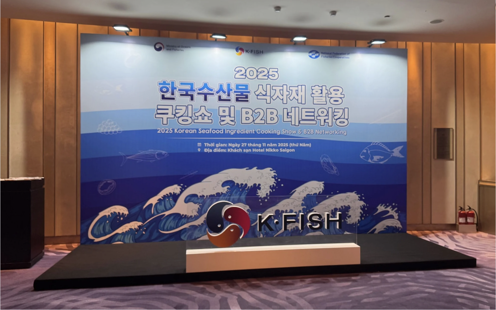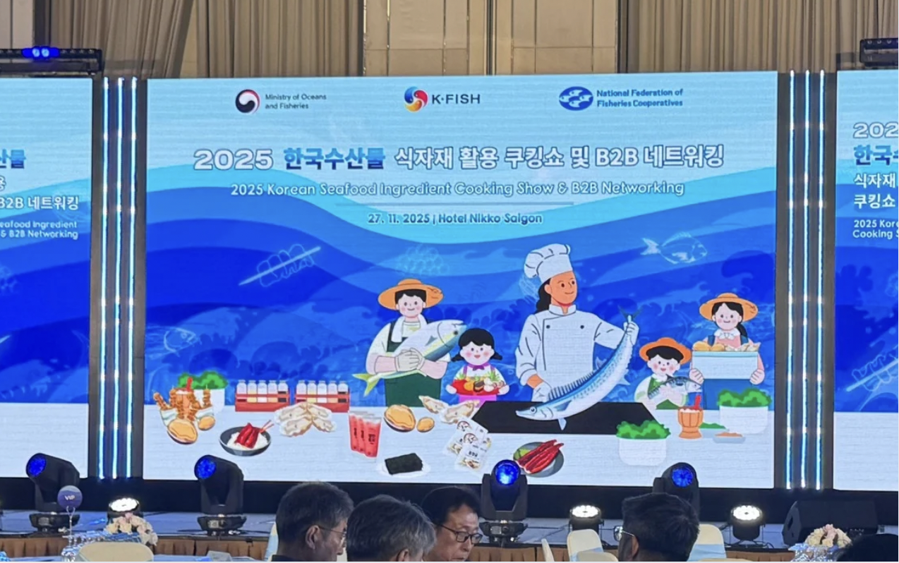 Trong khuôn khổ chuỗi hoạt động K-Seafood Global Week 2025, Trung tâm Hỗ trợ Thương mại K-Seafood (Korea Seafood Trade Support Center) phối hợp cùng Bộ Đại dương và Thủy sản Hàn Quốc và Liên đoàn Hợp tác Ngư nghiệp Quốc gia Hàn Quốc đã tổ chức sự kiện Giao thương B2B & Cooking Show ngày 27/11/2025 tại Khách sạn Nikko Sài Gòn. Đây là một trong những hoạt động tiêu biểu nhằm giới thiệu nguồn hải sản chất lượng cao của Hàn Quốc đến thị trường Việt Nam, đồng thời mở ra cơ hội hợp tác rộng lớn cho các doanh nghiệp F&B hai nước.