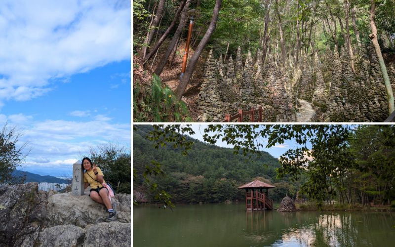 Izquierda: La reportera honoraria Laura López Velázquez posa en la cima de Paryongsan. Derecha: Sendero del parque Doltap con las pagodas de piedra (arriba) y el estanque Bongam con su pabellón (abajo). | Laura López Velázquez