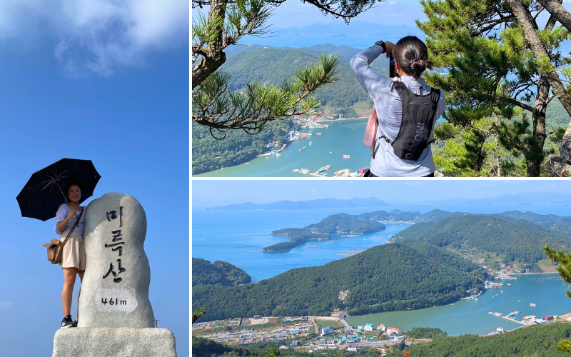 Se muestra a la reportera honoraria Laura López Velázquez durante sus dos visitas a Mireuksan y la vista panorámica de Tongyeong desde la cima de la montaña. | Laura López Velázquez