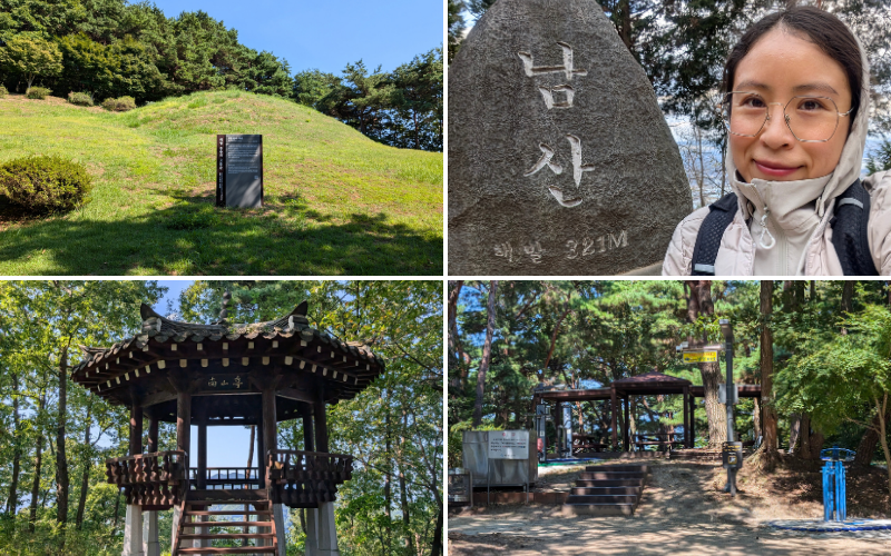 A la izquierda se encuentran las tumbas antiguas de Jungdong-ri, seguida por la reportera honoraria Laura López Velázquez en la cumbre de Namsan, luego el área de descanso de la montaña y, finalmente, un pabellón situado en el sendero principal. | Laura López Velázquez