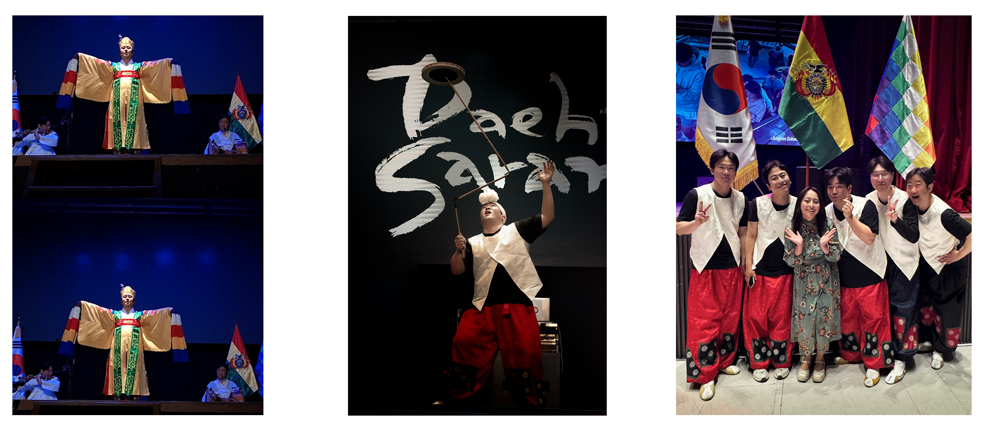 Nos transportamos en el tiempo a través de sonidos de tambores que, vibrantes, comenzaron a marcar un pulso que hacía vibrar el suelo; una Corea tradicional se presentó frente a nosotros con Daehansaram a través de instrumentos tradicionales y una base rítmica que incorporó elementos electrónicos. logrando crear una atmósfera alegre para todos. Esta integración de ritmos ancestrales con contemporáneos nos permite entender la capacidad de la cultura coreana para evolucionar y adaptarse. Esta fusión no solo captó la atención de los asistentes, sino que también permitió acercar al público boliviano a una expresión artística que refleja el equilibrio entre herencia cultural e innovación.