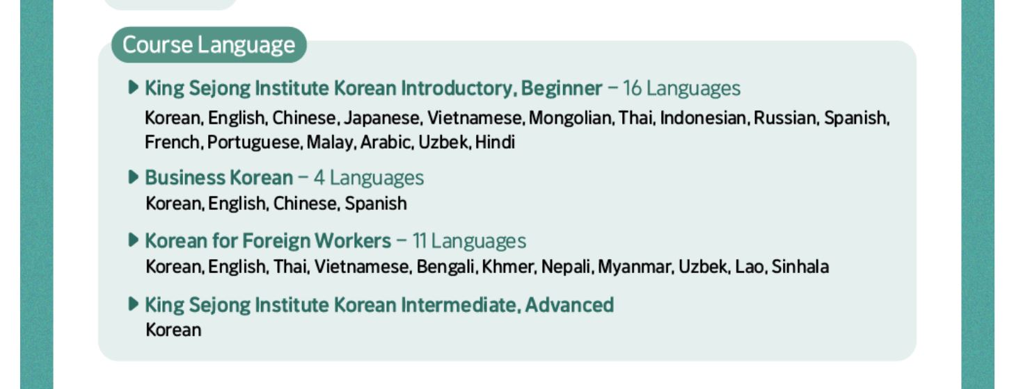 Ofrecen clases desde el nivel introductorio hasta nivel avanzado, incluyendo Business Korean que abarca vocabulario y temas relacionados con el entorno laboral. Tienen clases disponibles en español, inglés y más de diez idiomas distintos dependiendo del aula que escojas. A excepción de las clases de niveles más avanzados que se ven en coreano en su totalidad.