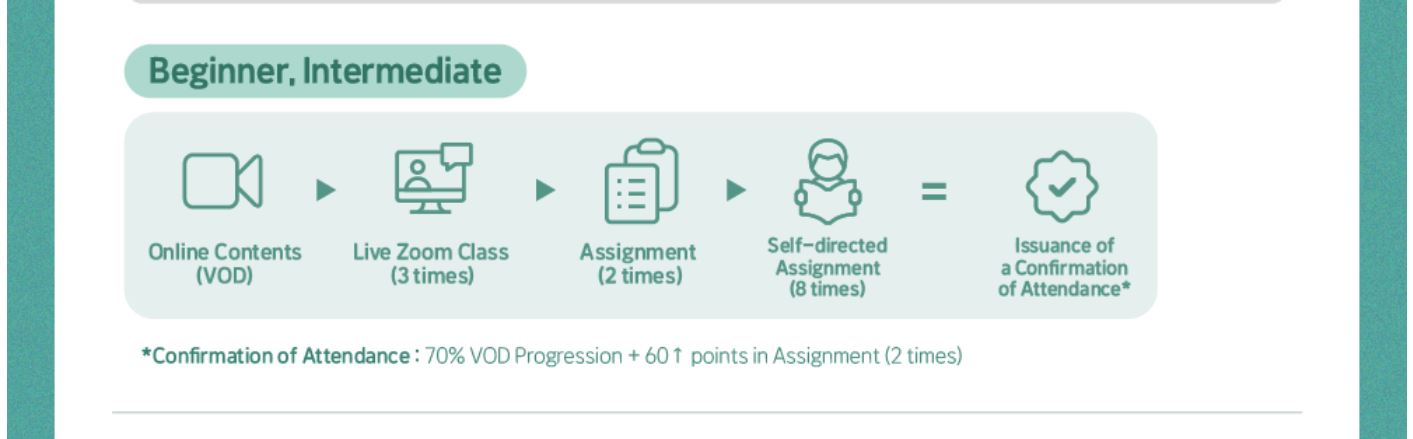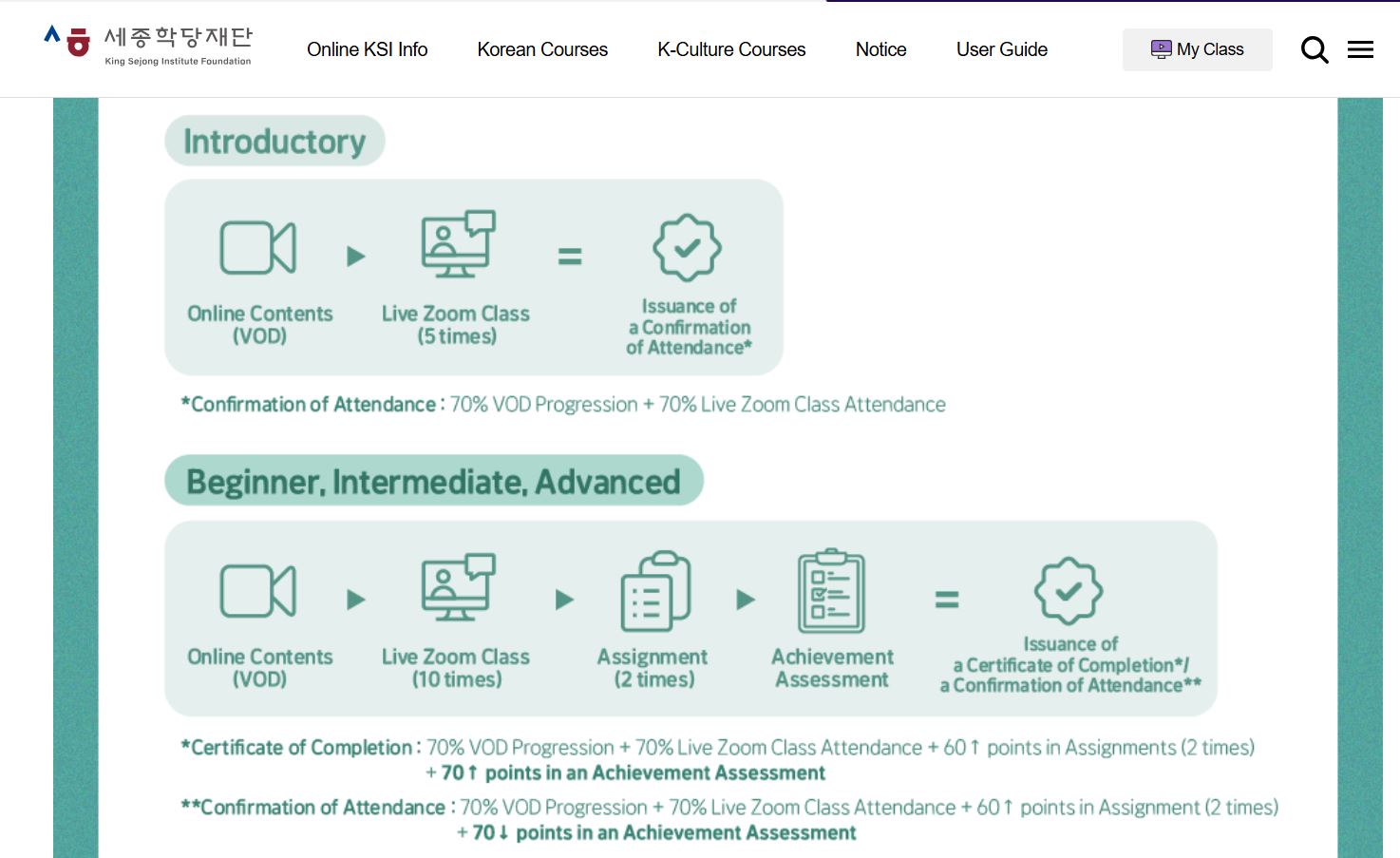 Las clases son una vez a la semana, tienen una duración de una hora y media aproximadamente, el puntaje para aprobar las tareas es de 60 puntos o más. Incluyendo ver todos los materiales y vídeos de apoyo que se otorgan al menos en un 70% para lograr obtener el certificado de completación del curso. En la sección de Nuri KSI también hay varios libros de texto disponibles, dinámicas, y foros en los que puedes participar. El primer trimestre siempre inicia a finales de febrero sin embargo es ideal revisar sus redes sociales (king.sejong.institute) para saber cuándo ingresar a inscribirte.