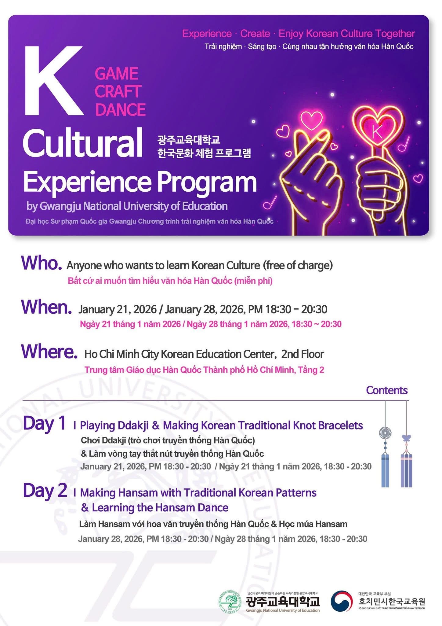 Chương trình Trải nghiệm văn hóa Hàn Quốc do Trường Đại học Sư phạm Quốc gia Gwangju tổ chức tại Trung tâm Ngôn ngữ tiếng Hàn TP.HCM vào ngày 21/01 và 03/02/2026 là một hoạt động tiêu biểu theo tinh thần đó. Với hai ngày hoạt động bao gồm các trải nghiệm văn hóa như chơi Ddakji, làm vòng tay thắt nút truyền thống, làm Hansam và học múa Hansamchum. Tham gia vào buổi học thứ hai đã mang lại cho mình những trải nghiệm độc đáo cùng Hansam - dải lụa gắn liền với nghệ thuật múa truyền thống Hàn Quốc.