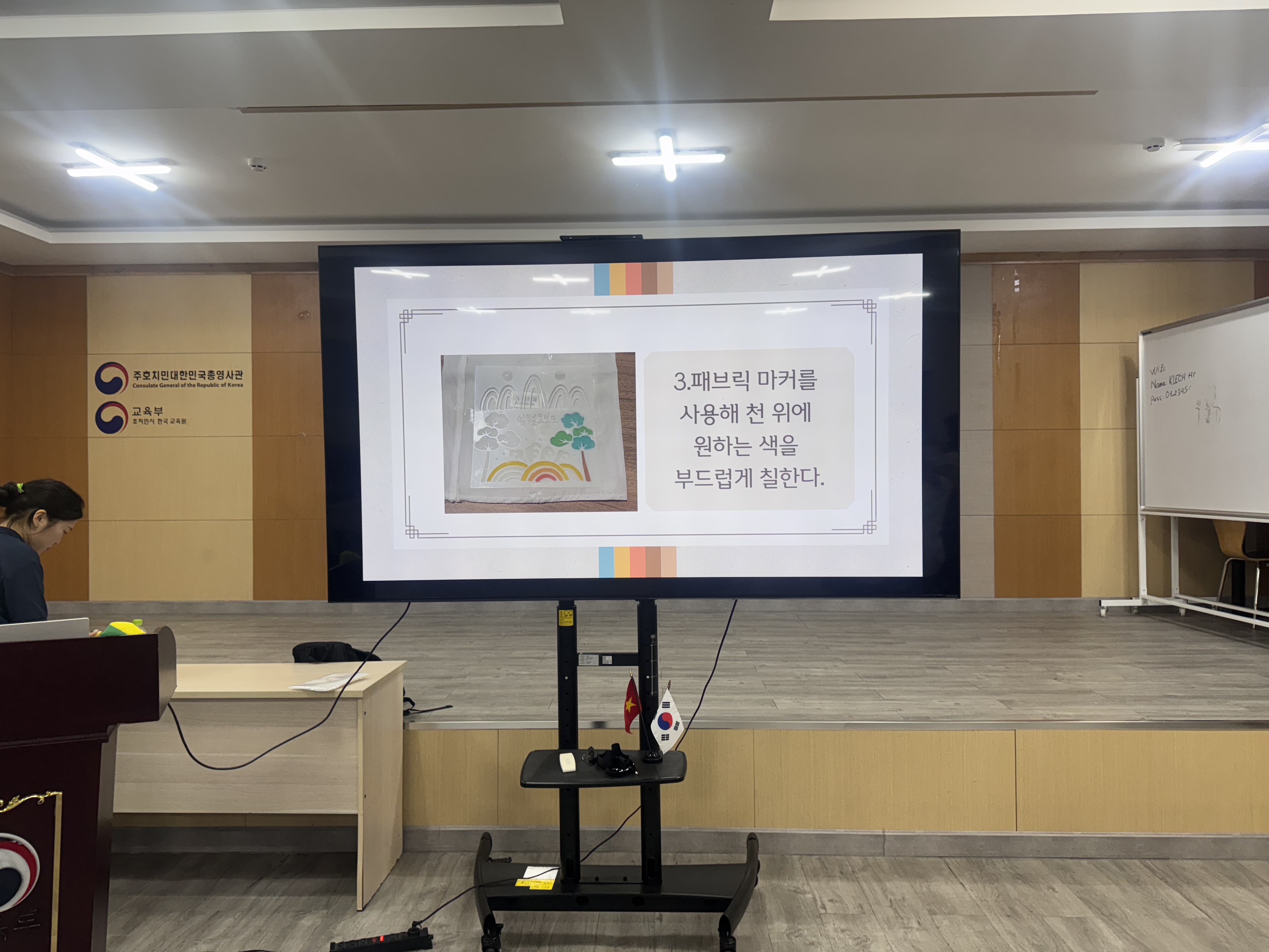 Trong phần trải nghiệm thực hành, mình cùng các bạn tham gia được tự tay làm Hansam với hoa văn truyền thống, từ việc lựa chọn màu sắc đến cách bố trí họa tiết. Mỗi chi tiết đều phản ánh tư duy thẩm mỹ đặc trưng của văn hóa Hàn Quốc với sự hài hòa và cân đối luôn được đề cao.