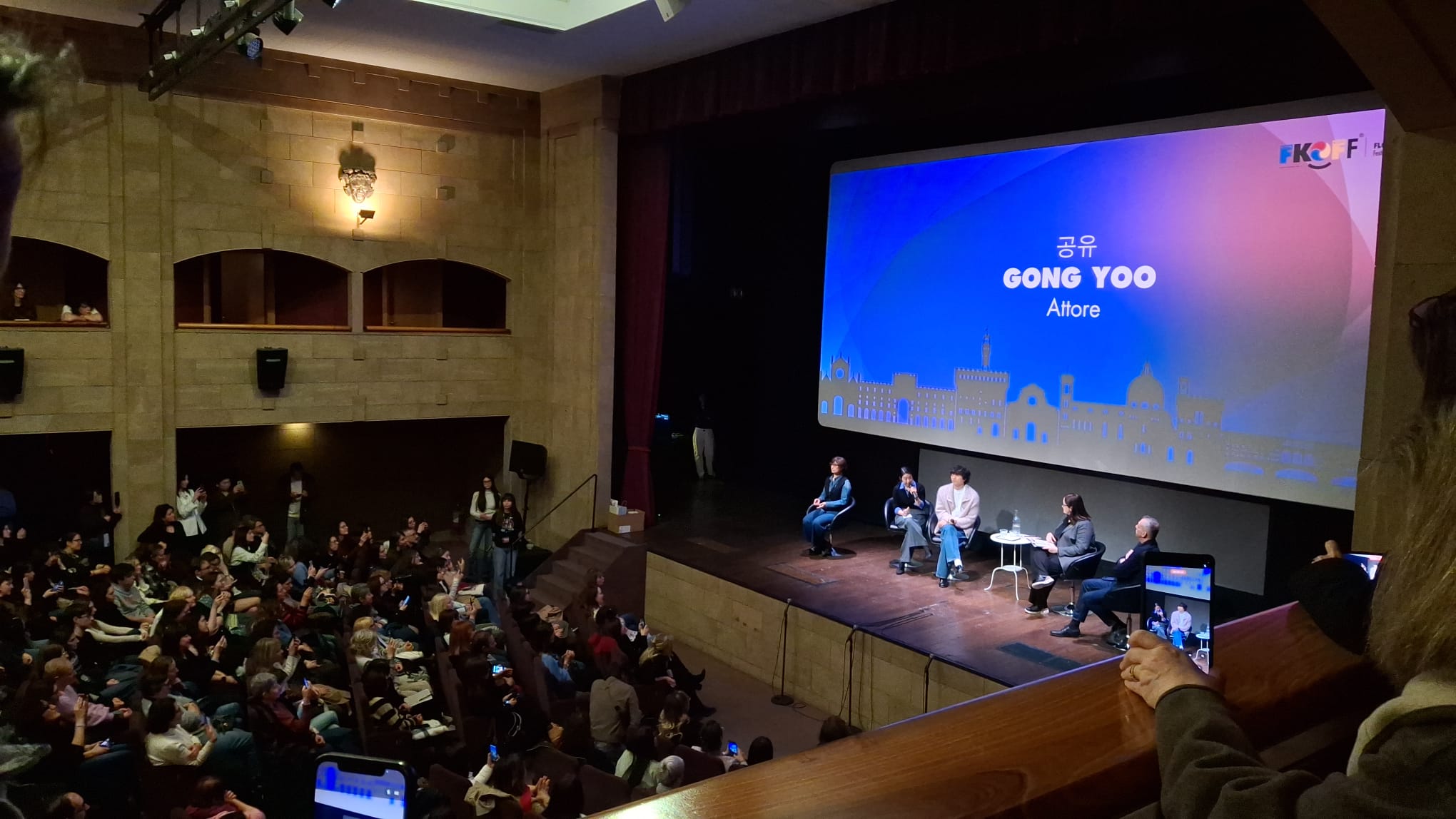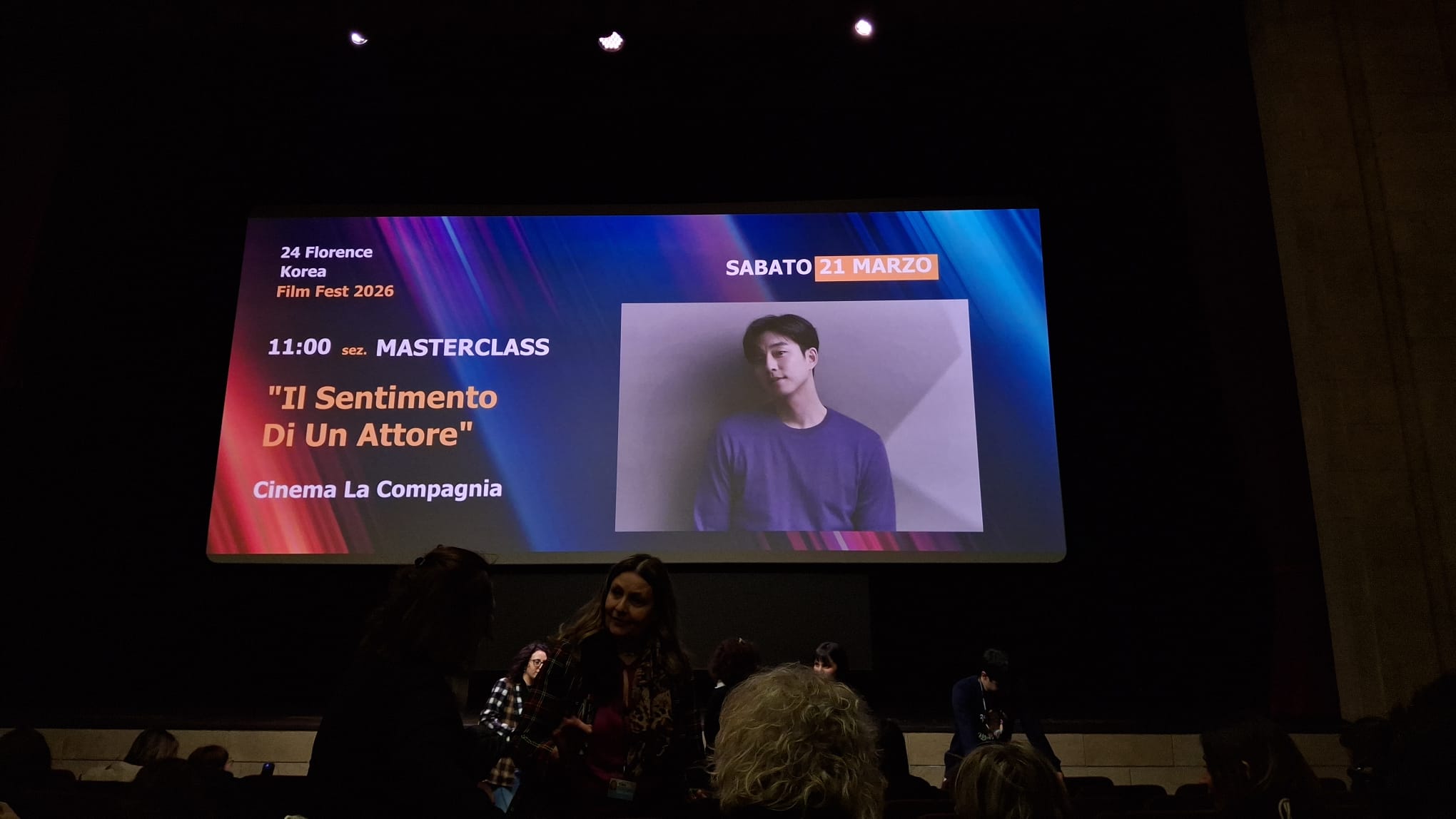 On March 21, 2026, Korean actor Gong Yoo held a Masterclass at Cinema La Compagnia in Florence as a special guest at the 24th edition of the Korea Film Fest. The Masterclass was held at 11:00 a.m., but people lined up hours in advance to secure the best seats for the long-awaited meeting with the international celebrity. I was able to attend as an Honorary Reporter, and it was a truly moving and engaging experience. Gong Yoo, now in his 25th year in film, retraced the years that marked a turning point in his career. He spoke about himself through his roles and engaged the audience in an informal conversation, moderated by Caterina Liverani, during which the actor seemed very comfortable discussing his emotions and his involvement with the projects he has participated in throughout his long career.