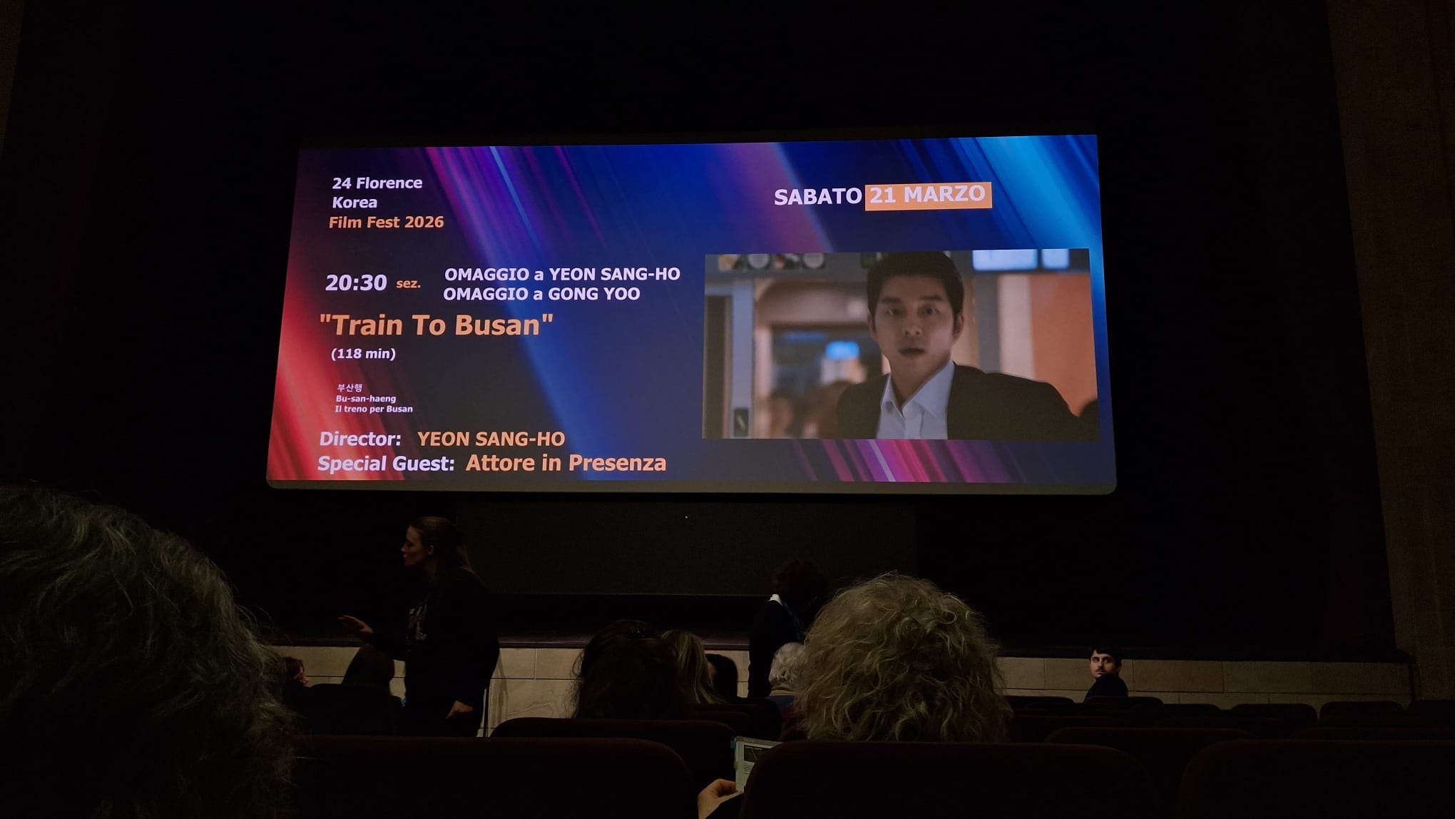 That same evening, the festival was also hosting the screening of Train To Busan, to celebrate its tenth anniversary. Gong Yoo opened the screening with a final farewell to the festival. In the morning, during the Masterclass, Gong Yoo stated that he accepted the role in this movie immediately after reading the script, thinking it was perfect. He wanted to participate in such an original project, given that zombie films were usually a Hollywood exclusive, and he thought that the fact that Yeon Sang-ho had previously worked primarily in animation would contribute to the film's spectacular nature. Train To Busan, set inside the KTX train carriages, effectively captured the attention of audiences at Cannes, becoming an instant cult, and the sold-out screening on March 21 in Florence demonstrated the power of seeing a film on the big screen. During the screening, which for a few was the first and for many the umpteenth, everyone shared the same emotions, laughing, crying, they were scared and it was perfect because cinema is born as sharing and that is how it must continue to live, a moment that I choose to share with many people I do not know, but who will experience as many emotions as I do when watching a film.