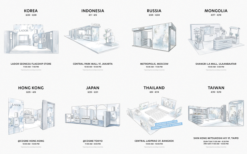 Магазины-корнеры La'dor открылись в нескольких точках мира: Корея, Индонезия, Гонконг, Япония, Россия, Монголия, Таиланд и Тайвань.