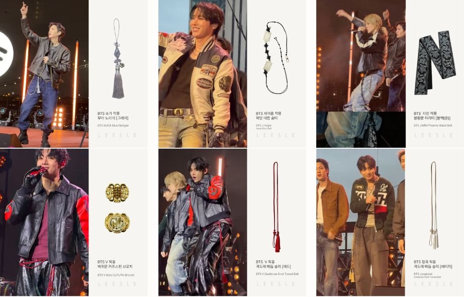 For the global stage performances, Hwang prepared a wide variety of options to ensure flexibility in styling and selection. She also created nine new pieces in addition to their existing collection and sent more than 60 accessories to BTS’ team. They were designed with two clear considerations in mind: they needed to be stage-ready for immediate use and visually communicate Korean identity at a glance. The result included tassel belts with gwidorae knots, norigae ornaments, traditional knot details, and a bat-motif brooch—each piece preserving traditional structures and symbolic integrity while being adapted for modern wearability.
