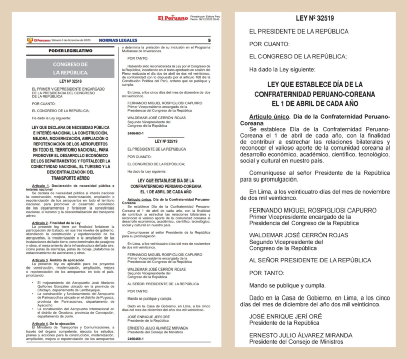 Tras la aprobación por parte del pleno del Congreso, el presidente encargado del Congreso peruano, Fernando Rospigliosi Capurro, firmó la autógrafa de ley el 24 de noviembre de 2025, en un acto en el que asistieron diferentes autoridades, entre ellas, el embajador de Corea en Perú, Choi Jong-uk; el presidente de la Liga Parlamentaria de Amistad Corea-Perú, Min Hong-chul, y Víctor Flores, presidente de la Liga Parlamentaria de Amistad Perú-Corea.