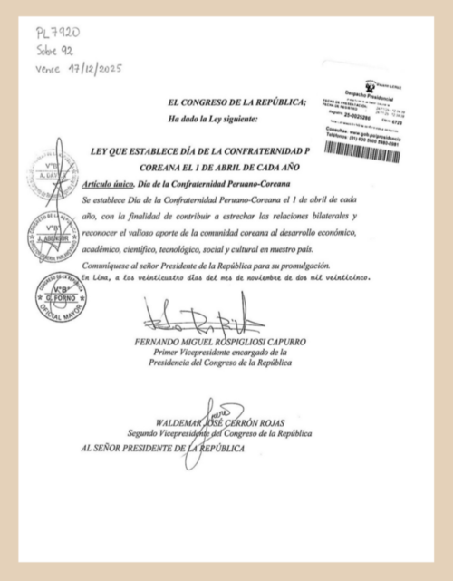 Con la finalidad de contribuir a estrechar las relaciones bilaterales y reconocer el aporte de la comunidad coreana al desarrollo del Perú, el 19 de noviembre de 2025, el Congreso de Perú aprobó, con 105 votos a favor y exonerado de la segunda votación, el dictamen del proyecto de ley 7920/2023-CR que establece el 1 de abril como el Día de la Confraternidad Peruano-Coreana, fecha que coincide con el inicio de las relaciones diplomáticas entre ambas naciones, establecida el 1 de abril de 1963