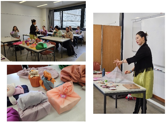 To conclude the last of the two workshops, Lauriane, one of the participants, gave her impressions on the activity: "This is my first time attending the event as a visitor, as I was previously part of the organising committee; so it is great to be able to enjoy the activities, especially one such as the Korean bojagi wrapping, which is new and wasn't offered the previous years. I have some furoshiki at home but I didn't get to make very nice wrappings, so I wanted to try it here as I also found bojagi very beautiful. The workshop was great, Liz Yoon was a very good teacher and the materials as well as the way of making it were very relaxing."