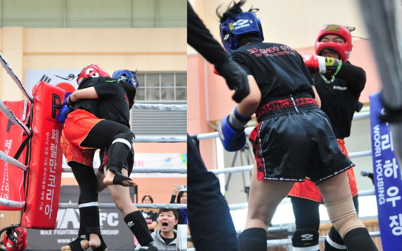 Nuryna: I participated in my first Muay Thai competition last April 22nd at Daegu Wolbae Sports Training Center accompanied, and my friend as well as the director of my Muay Thai gym, Fearless Gym Wangsmini. I compete under the -72kg category. The competition started with Amateur Muay Thai fights and proceeded to the Pro Kickboxing fight called MAX FC First League 25.