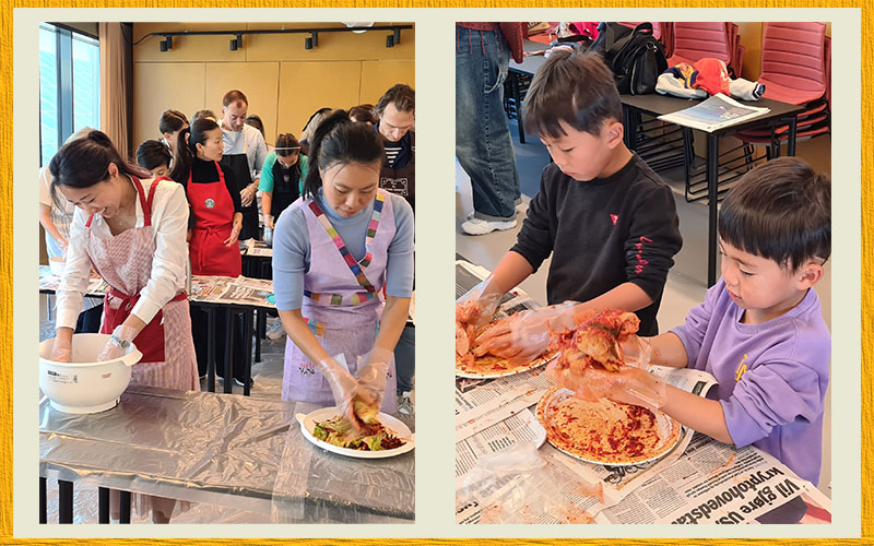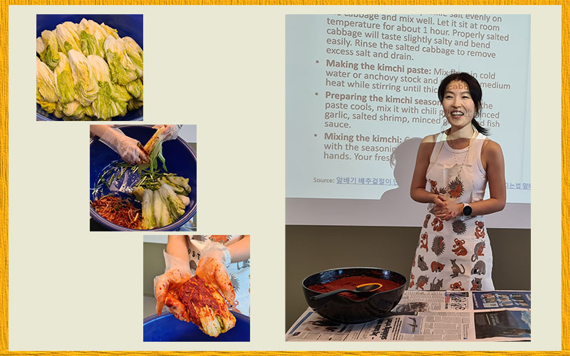 (Top left) Pre salted cabbage. (Center left) Spreading the kimchi paste between the cabbage leaves. (Bottom left) The finished kimchi. (Right) Ms. Namhee Oh explaining the process of making kimchi.