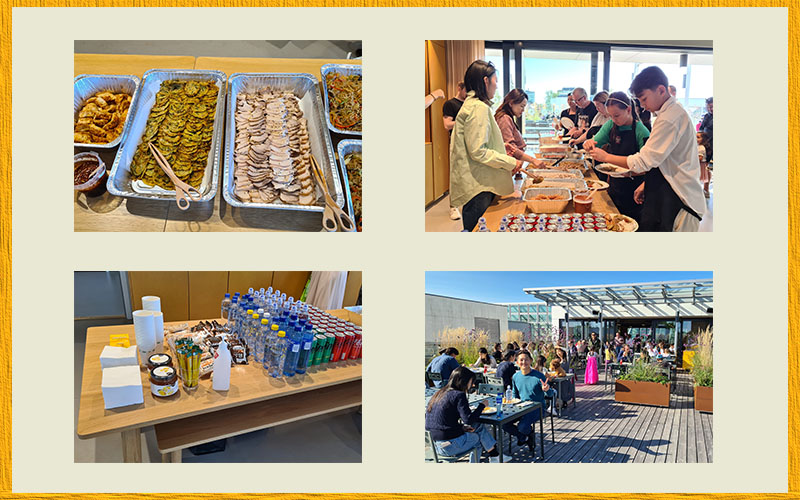 (Top left) Korean lunch buffet; mandu, pajeon, pork, japchae. (Bottom left) Serving table with Korean snacks and beverages. (Top right) Service. (Bottom right) Guests mingling and enjoying their food.