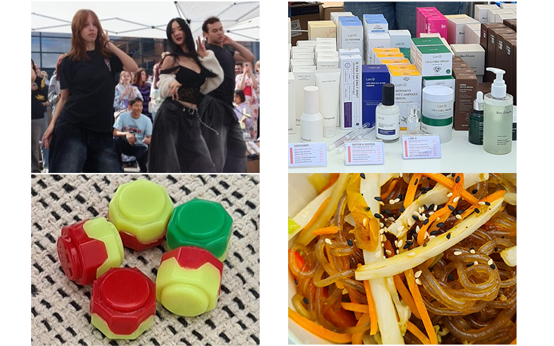 (Top left) K-pop dance workshop led by The Hadeland Folk High School. (Top right) K-beauty products. (Bottom left) ggonggi, Korean Jacks. (Bottom right) Japchae noodles, stir fried sweet potato noodles with vegetables.